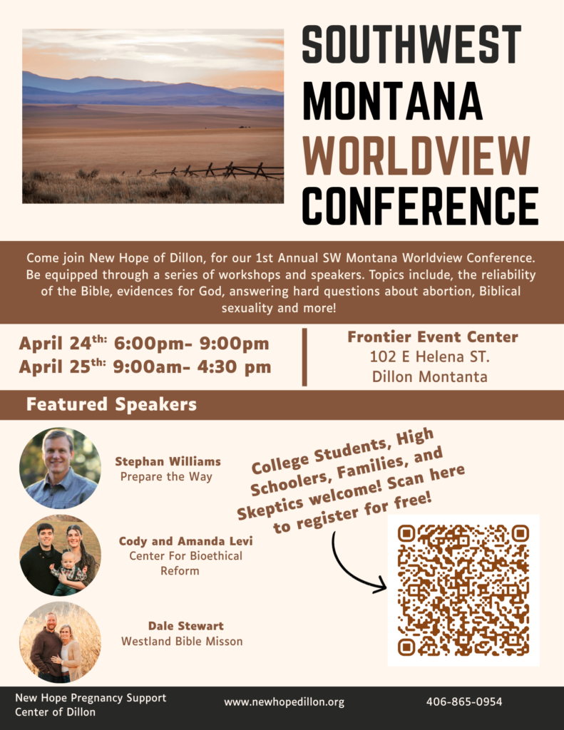 Southwest Montana Worldview ConferenceBy / April 10, 2026 Southwest Montana Worldview Conference 12 12 people viewed this event. Register for event To register for this event please visit the following URL: → Date And Time 2026-04-24 @ 06:00 PM to 2026-04-25 @ 04:30 PM Location 102 E Helena ST. Dillon Montana Share With Friends Facebook Twitter Linkedin Xing Pinterest